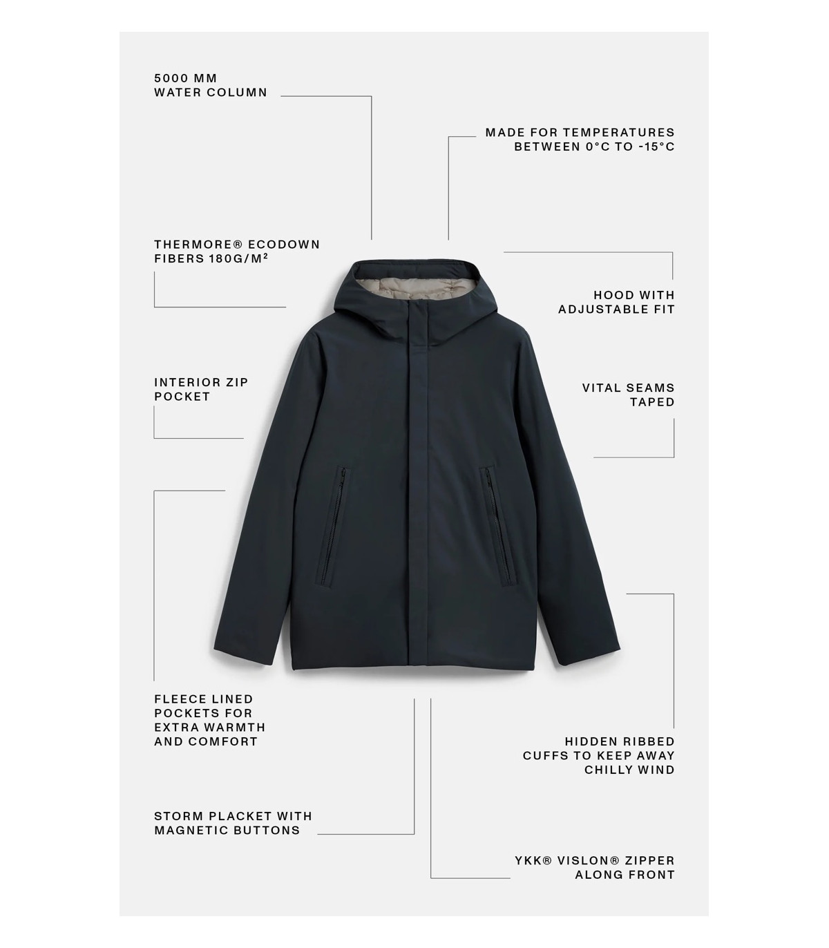 Diseñada para los desplazamientos y la libertad de movimiento, confeccionada en tejido Redux Grid 3K. Presenta una cremallera bidireccional, puños sutiles y una silueta moderna, ideal tanto para el principio como para el final de la temporada.