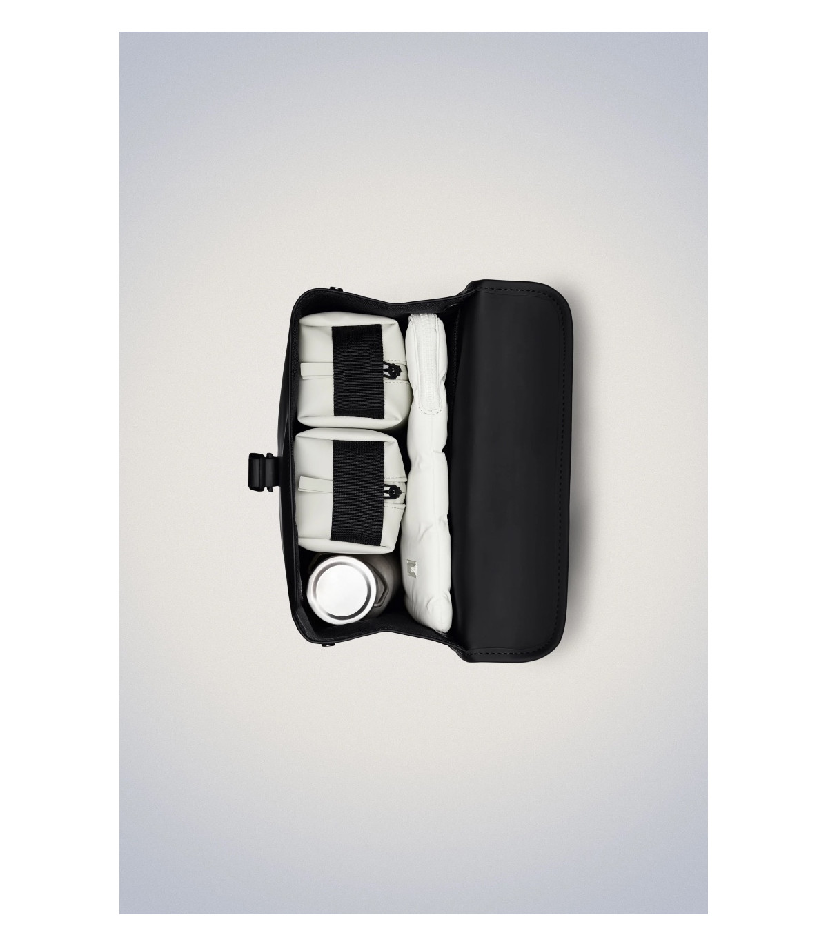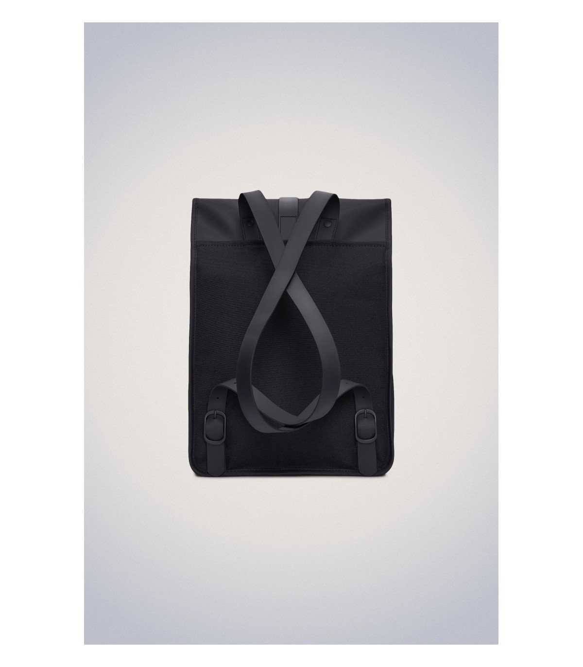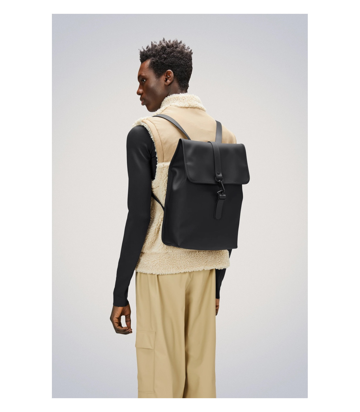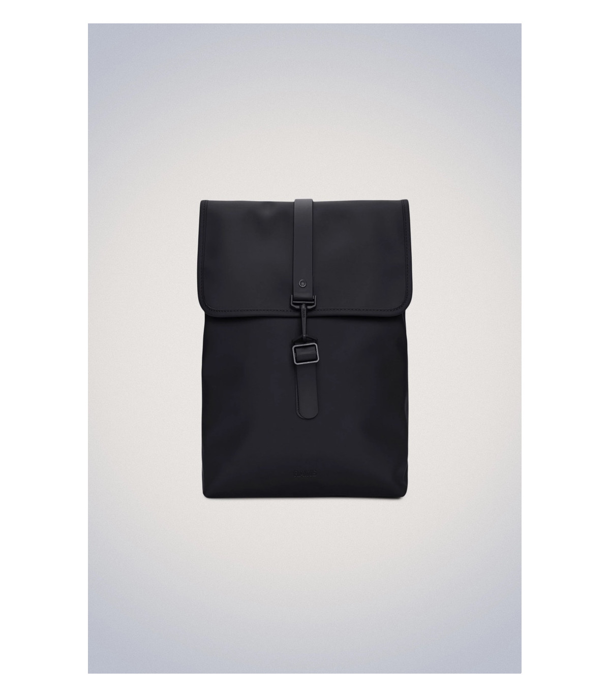 La silueta de la Rucksack personifica la estética de los bolsos de Rains, caracterizada por una prominente solapa y una correa central con cierre de mosquetón.
