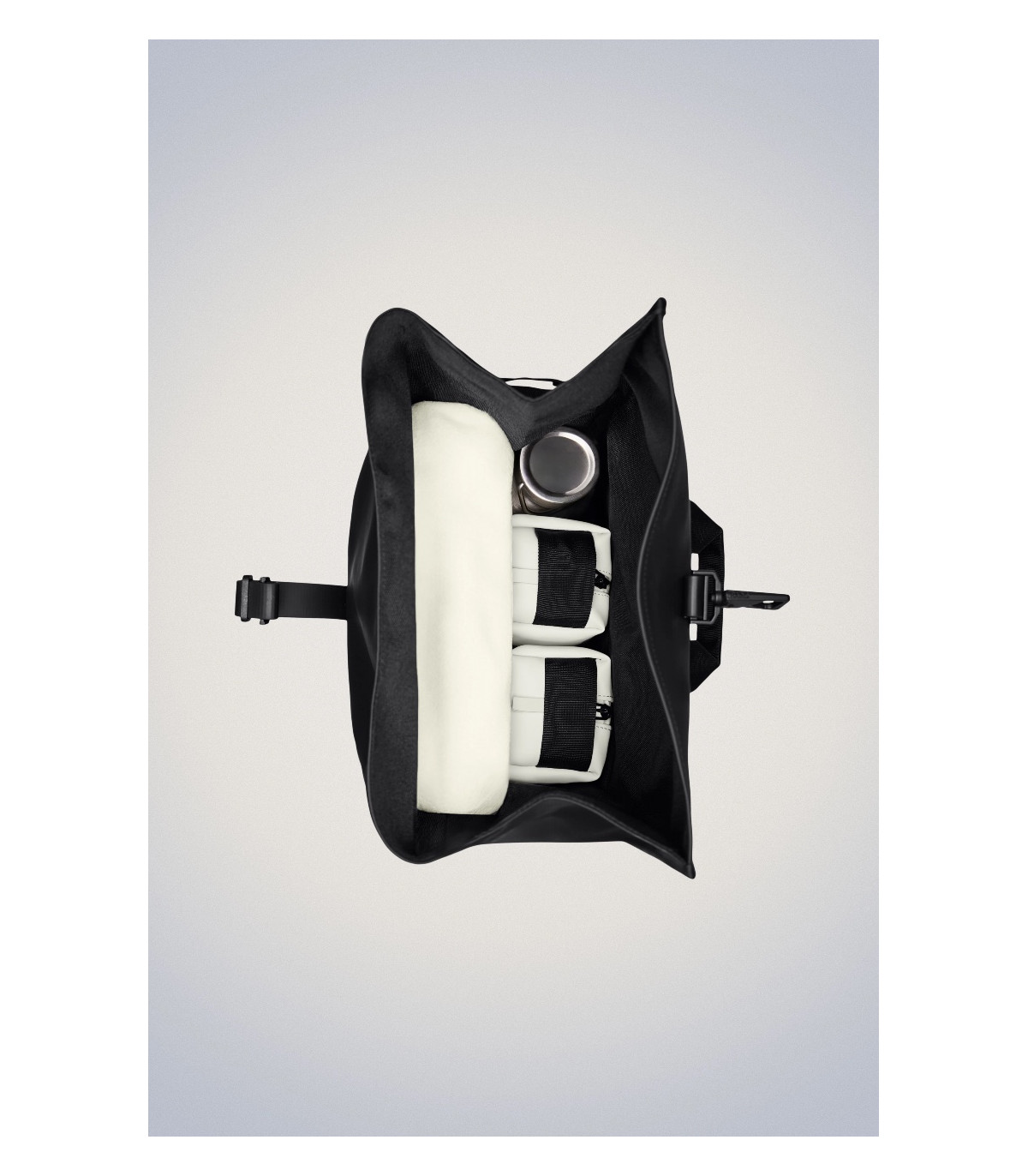 La mochila Rolltop más emblemática de Rains se presenta aquí revisada con mayores proporciones y funciones adicionales, incluyendo dos bolsillos laterales.